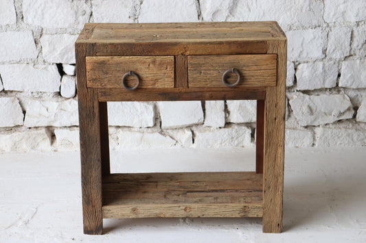 The Handcrafted Wooden Side Table, made from eco-friendly recycled wood, combines sustainability with unique craftsmanship....